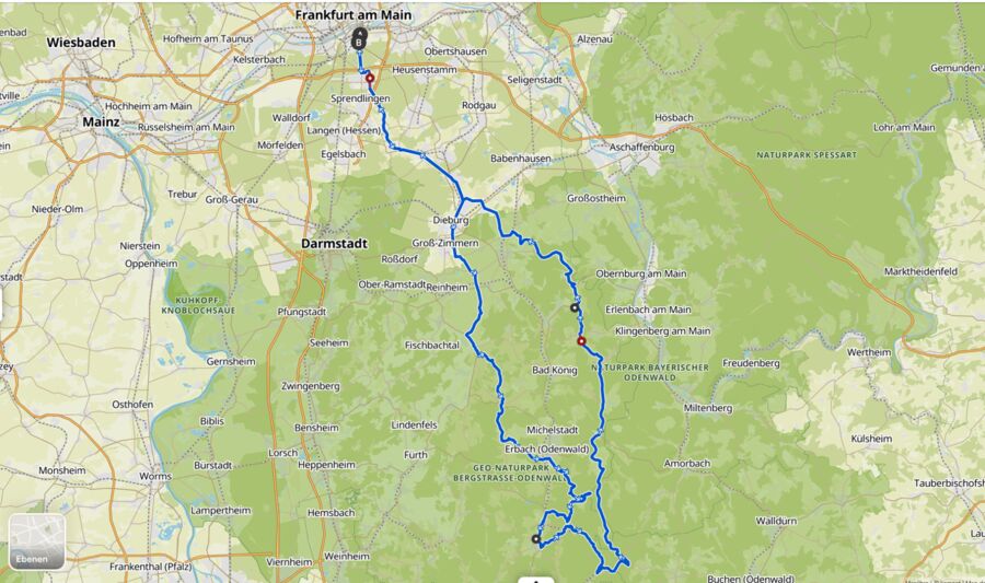 Frankfurt - Dieburg - Mossautal - Erbach - Bullauer Eutergrund (Ende der Welt) - Beerfelden - Kailbach - Hesselbach - Breuberg - Dieburg - Frankfurt (ca. 2300 Hm)